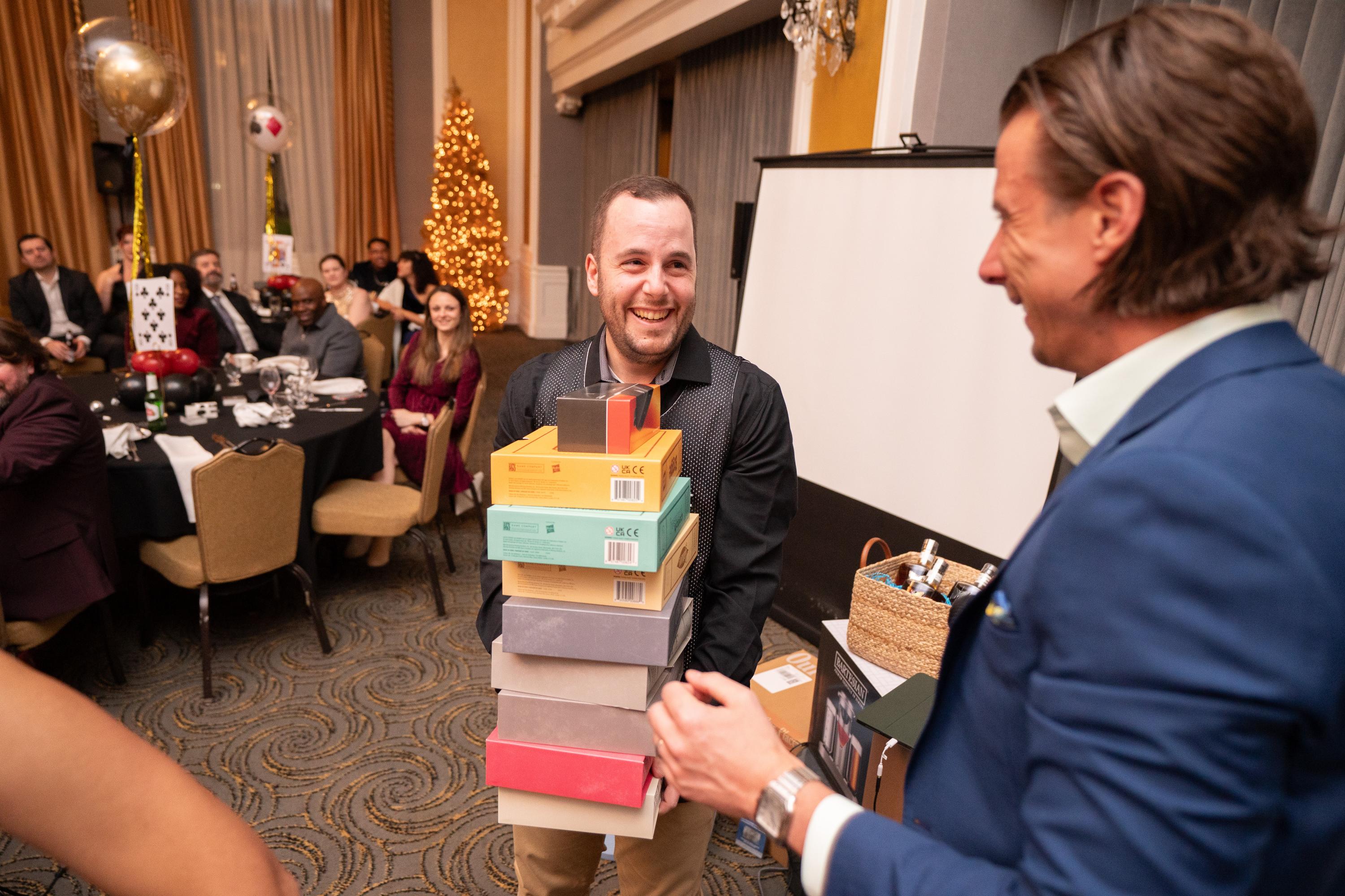 Along with delicious food and drinks, the evening featured local Baltimore magician Spencer Horsman of Illusions wowing guests and puzzling engineers during cocktail hour with up-close sleight of hand action. Later in the night, he tied it all together with a show that added an extra layer of fun to the night. The energy stayed high as we kicked off a fan-favorite part of the night, handing out curated gifts and prizes to each RC engineer.